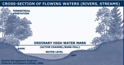 Ordinary high water mark (HWM) - The usual or average level to which a body of water rises at its highest point and remains for sufficient time so as to change the characteristics of the land. In flowing waters (rivers, streams) this refers to the "active channel/bank-full level" which is often the 1:2 year flood flow return level. In inland lakes, wetlands or marine environments it refers to those parts of the water body bed and banks that are frequently flooded by water so as to leave a mark on the land and where the natural vegetation changes from predominately aquatic vegetation to terrestrial vegetation (excepting water tolerant species). For reservoirs this refers to normal high operating levels (Full Supply Level).